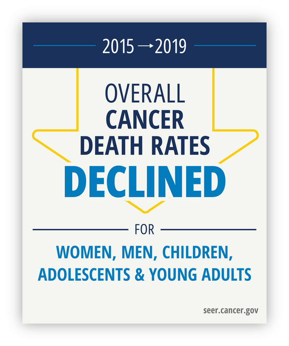 The report shows that from 2015 to 2019, overall cancer death rates decreased by 2.1% per year in men and women combined. Among men, death rates decreased by 2.3% per year; among women, death rates decreased by 1.9% per year. The annual declines in death rate accelerated from 2001 to 2019 in both men and women.