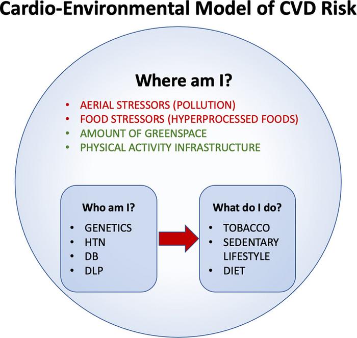 Aerial nano-aggressors (air pollution), food nano-aggressors (hyperprocessed food), the level of greening, and an environment encouraging (or not) physical activity are major environmental determinants of heart health. François Reeves, MD, FRCPC, and Brian J. Potter, MDCM, SM, FRCPC, both of the University of Montreal, propose a cardio-environmental model for cardiovascular risk assessment of easily evaluated factors by asking: (1) who is my patient? (family history, ethnicity, traditional risk factors, body mass index, and comorbidities); (2) what does my patient do? (eating habits, smoking, drugs, physical activity); and (3) where does my patient live? (air quality, food quality, urban environment).