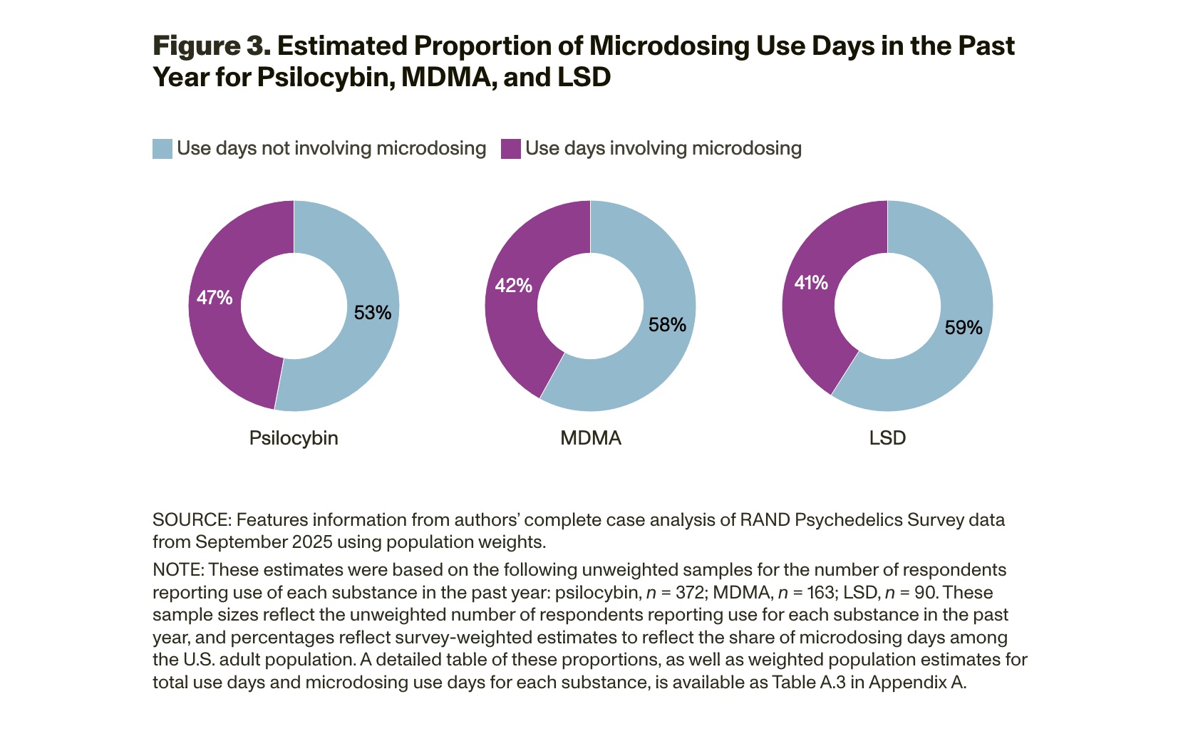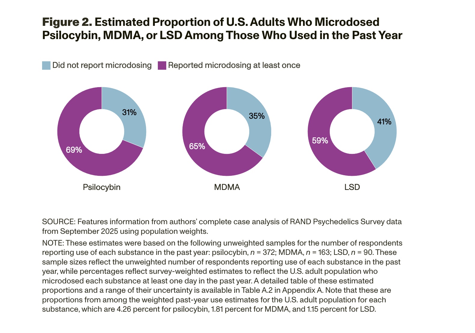 This report contributes to existing nationally representative data sources with population-weighted estimates of past-year use of psychedelics by U.S. adults from data collected in September 2025. We estimate the proportion of adults in the United States who have used a variety of psychedelics in the past year, including psilocybin, MDMA, ketamine, LSD, and Amanita muscaria mushrooms.[4] Then, we present groundbreaking estimates for how many U.S. adults have microdosed psilocybin, LSD, and/or MDMA in the past year. We also show a comparison of the number of days that U.S. adults used psilocybin, LSD, and MDMA in the past year and what share of those days involved microdosing.