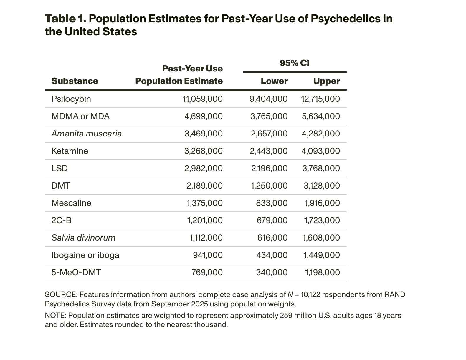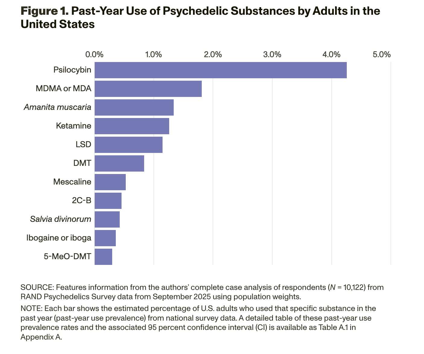 This is the first report from the 2025 RAND Psychedelics Survey, which was fielded in September 2025 to a probability-based, nationally representative sample[1] of 10,122 adults ages 18 years and older living in the United States at that time. This report presents top-line results on the use of 11 psychedelic substances and detailed information about microdosing (i.e., taking a small fraction of a full dose, often intermittently on a schedule) for psilocybin, LSD, and MDMA. These results should be of interest to those contemplating changes to psychedelics policies, researchers interested in use patterns (especially for microdosing), and others interested in learning more about these substances.