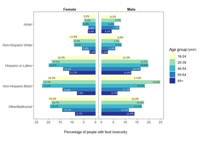 The researchers found that young, non-Hispanic Black males, middle-aged Black females and households with more children were the groups most likely to experience food insecurity. In addition, lower education and income as well as loss of employment were associated with increased food insecurity for all racial, gender and age groups studied.