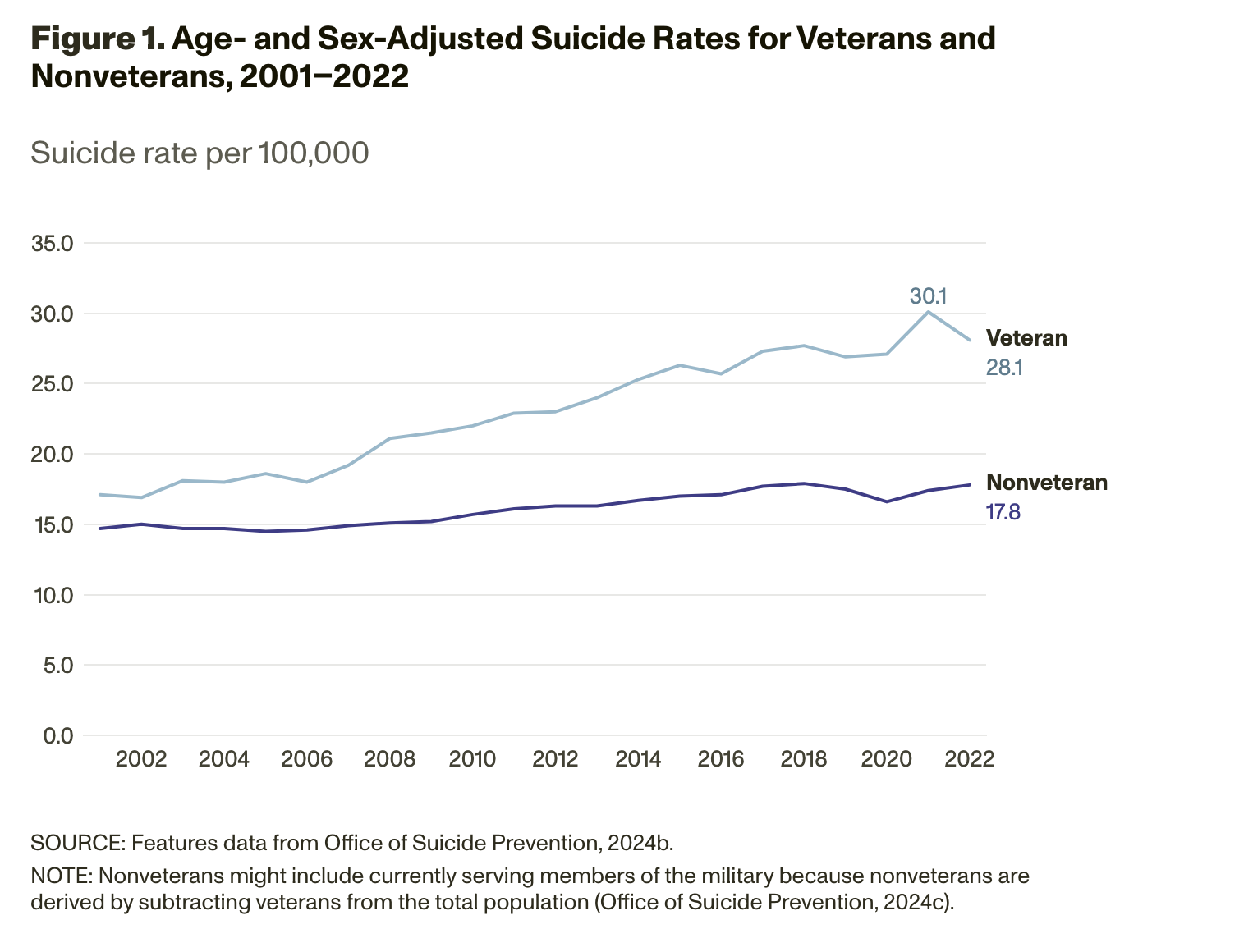 Each year, the U.S. Department of Veterans Affairs (VA) Office of Suicide Prevention releases critical statistics on veteran suicides in its National Veteran Suicide Prevention Annual Report. To examine trends over time, VA presents the veteran and nonveteran suicide rates adjusted to account for population differences between nonveterans and veterans, the latter of whom are younger and more are male. VA does this comparison by making both groups resemble the distribution of the U.S. adult population in 2000. Figure 1 shows age- and sex-adjusted suicide rates for veterans and nonveterans from 2001 to 2022. Since 2005, the suicide rate has risen faster for veterans than it has for nonveteran adults, although the veteran suicide rate decreased slightly between 2021 and 2022 (Office of Suicide Prevention, 2024b).