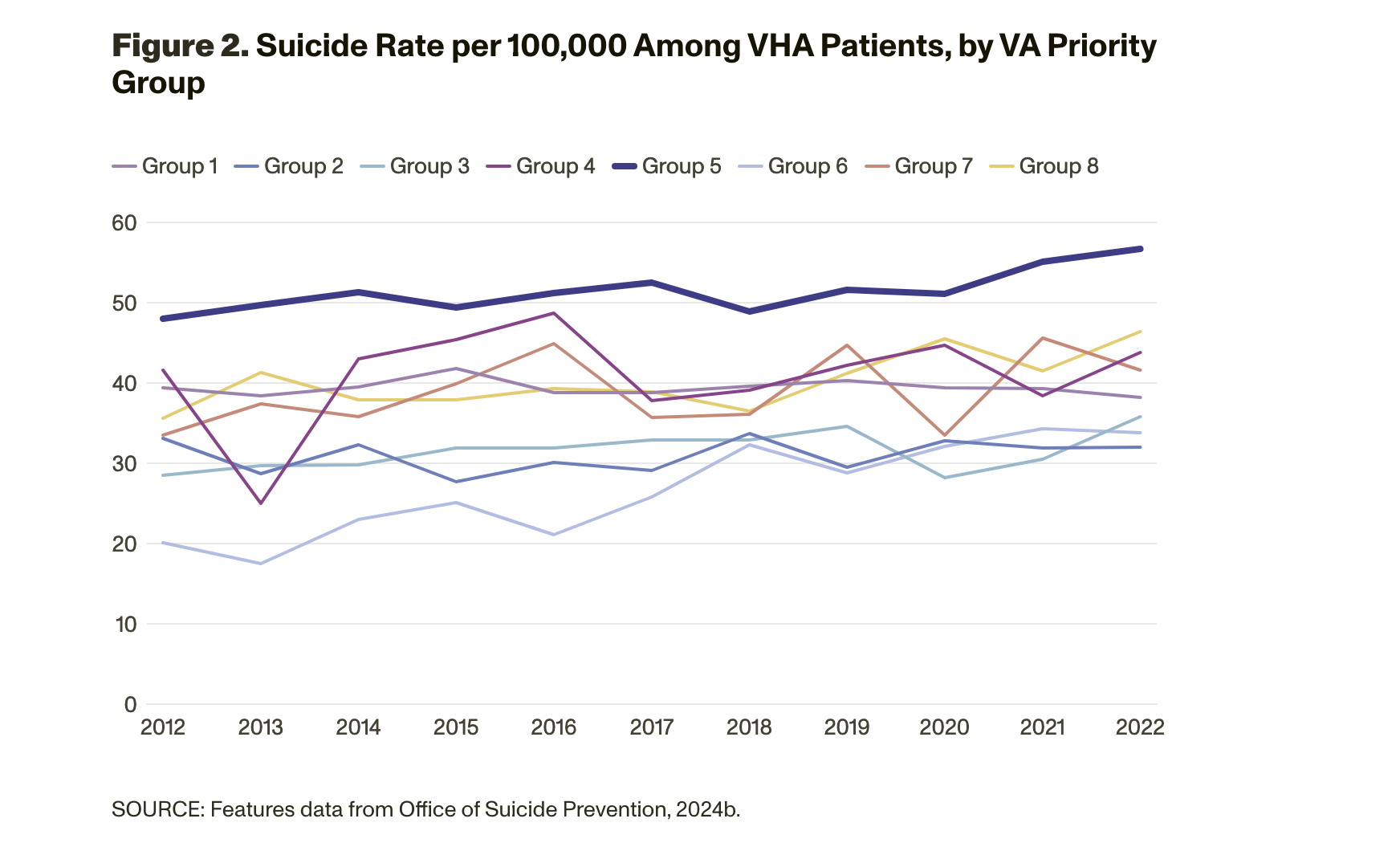 VA assigns a priority group to veterans who access VHA care (numbered 1 through 8) according to various factors, including service history, disability rating, income, and eligibility for other programs. The second largest group is Priority Group 5, which includes veterans eligible for care because of low income rather than a service-connected disability; in 2024, this group accounted for 759,704 VHA patients (VA, 2024a). From 2012 to 2022, veterans in Priority Group 5 consistently had the highest suicide rate, which is presented in Figure 2 (descriptions of other priority group criteria are available at Office of Suicide Prevention, 2024b).