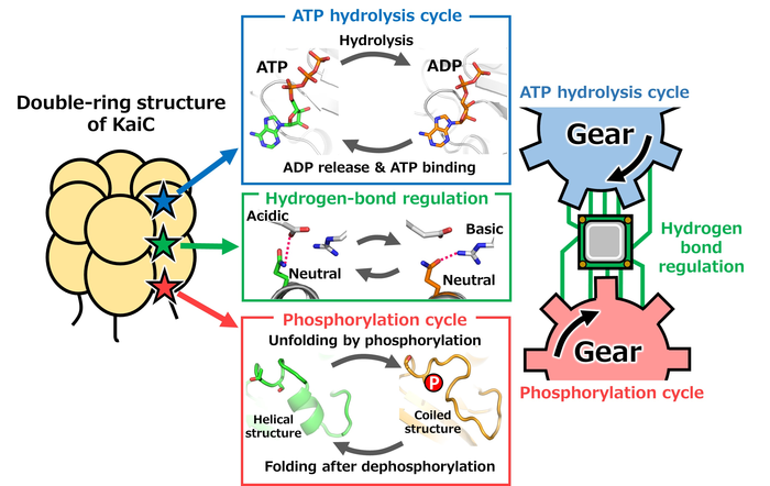 The KaiC protein rhythmically activates and inactivates the reaction cycles autonomously to regulate assembly states of other clock-related proteins. So thinking about their next steps, the team might use structural biology to reveal the atomic mechanisms of acceleration and deceleration of the gear rotations. “Our goal is to see all cyanobacterial clock proteins during the oscillation at an atomic level and to describe the moment that the ordered rhythm arises from chaotic atomic dynamics,” Furuike said.