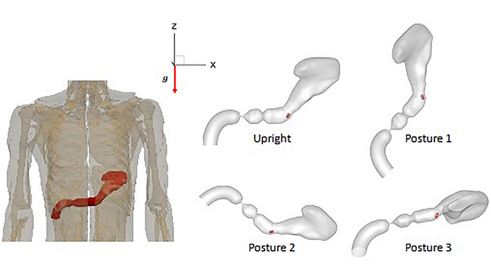 In Physics of Fluids, researchers from Johns Hopkins University and Johns Hopkins School of Medicine employ a biomimetic in-silico simulator based on the realistic anatomy and morphology of the stomach – a “StomachSim” – to investigate and quantify the effect of body posture and stomach motility on drug bioavailability.