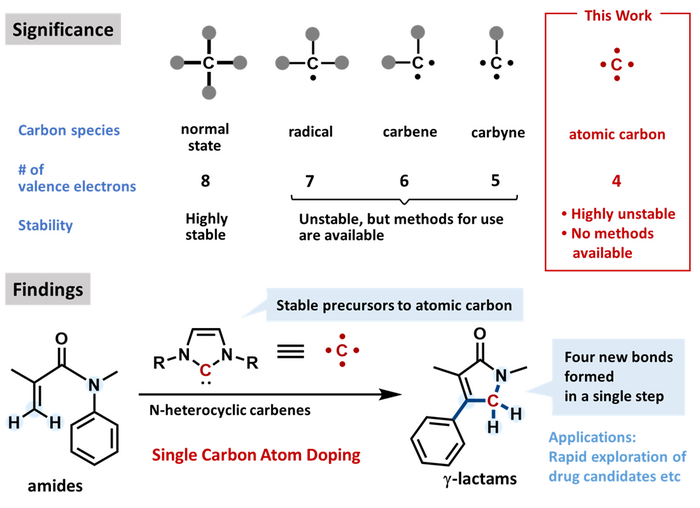 “Because atomic carbon is too unstable for use in organic synthesis, reagents such as dihalocarbenes are basically all that’s available as atomic carbon equivalents,” explains Miharu Kamitani, the lead author of the study. “We have expanded the toolkit for such reactions and have applied our technique to an established pharmaceutical.”