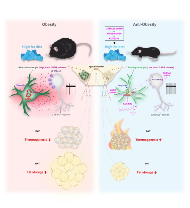 It was also discovered that suppressing the expression of the MAO-B gene in reactive astrocytes can decrease GABA secretion, thereby reversing the undesirable inhibition of the GABRA5 neurons. Using this approach the researchers were able to increase the heat production in the fat tissue of the obese mice, which allowed them to achieve weight loss even while consuming a high-calorie diet. This experimentally proves that the MAO-B enzyme in reactive astrocytes can be an effective target for obesity treatment without compromising appetite.