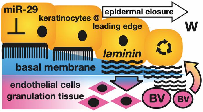 These findings in both mice and humans demonstrate the role of microRNA-29 in epidermal repair and suggest that the release of microRNA-29 targets, particularly LAMC2, promotes wound healing. The inhibition of microRNA-29 and/or overexpression of LAMC2 may be a new and effective strategy for improving wound healing.