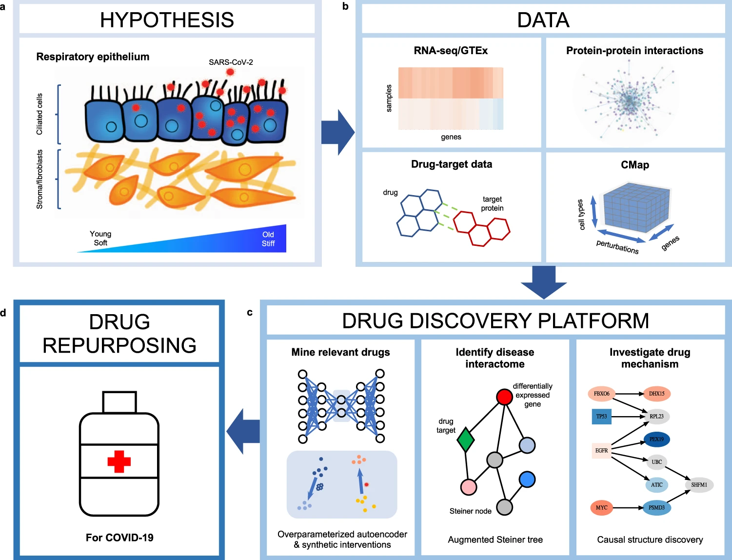 The researchers zeroed in on the most promising drug repurposing candidates in three broad steps. First, they generated a large list of possible drugs using a machine-learning technique called an autoencoder. Next, they mapped the network of genes and proteins involved in both aging and SARS-CoV-2 infection. Finally, they used statistical algorithms to understand causality in that network, allowing them to pinpoint “upstream” genes that caused cascading effects throughout the network. In principle, drugs targeting those upstream genes and proteins should be promising candidates for clinical trials.