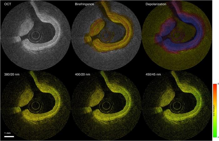 To address this need, the researchers embarked on a multi-year research project to develop and validate multispectral FLIM as an intravascular imaging modality. FLIM can provide insights into features such as the composition of the extracellular matrix (the protein scaffolding between cells), the presence of inflammation and the degree of calcification inside an artery. In earlier work, they combined FLIM with intravascular ultrasound, and in this new work they combined it with PSOCT. PSOCT provides high-resolution morphological information along with birefringence and depolarization measurements. When used together, FLIM and PSOCT provide an unprecedented amount of information on plaque morphology, microstructure and biochemical composition.