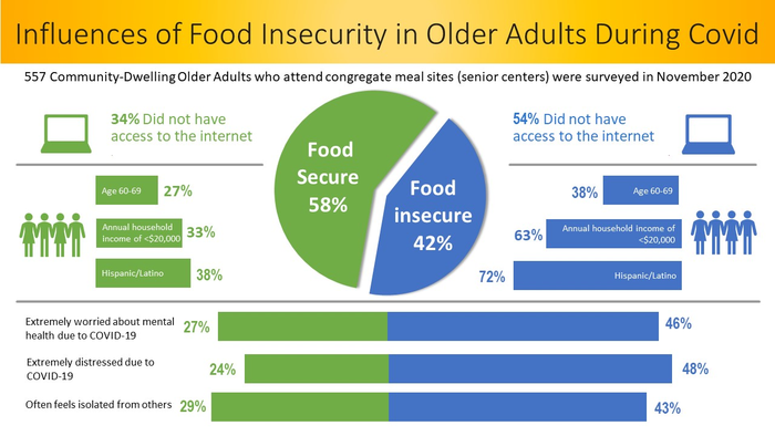 In a new study, researchers from University of Texas at San Antonio sought to find out how technology use and access are related to food security in at-risk, independently living older adults during COVID-19. The researchers analyzed results from surveys of 557 older adults who attended congregate meal sites in November 2020. Forty-two percent of respondents indicated they were food insecure during the survey period. The analysis revealed that food insecurity in older adults during the COVID-19 pandemic was associated with poorer social and mental well-being and less access to the internet. These findings suggest that technology access should be considered when developing interventions to address food insecurity for older adults.