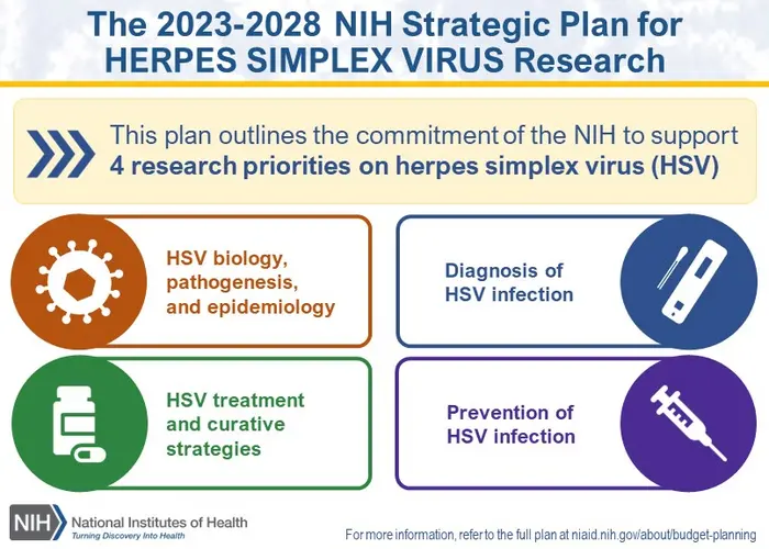 In response to the persistent health challenges of herpes simplex virus 1 (HSV-1) and HSV-2, today the National Institutes of Health released the Strategic Plan for Herpes Simplex Virus Research. An NIH-wide HSV Working Group developed the plan, informed by feedback from more than 100 representatives of the research and advocacy communities and interested public stakeholders. The plan outlines an HSV research framework with four strategic priorities: improving fundamental knowledge of HSV biology, pathogenesis, and epidemiology; accelerating research to improve HSV diagnosis; improving strategies to treat HSV while seeking a curative therapeutic; and, advancing research to prevent HSV infection.